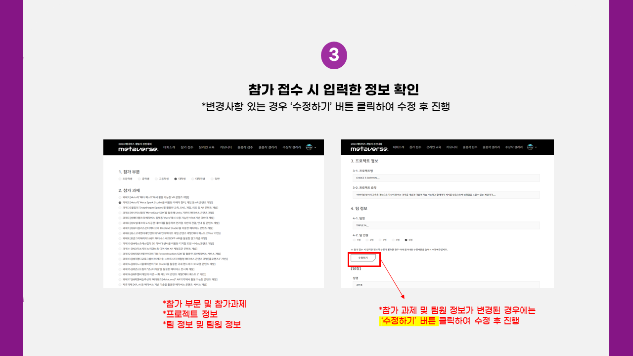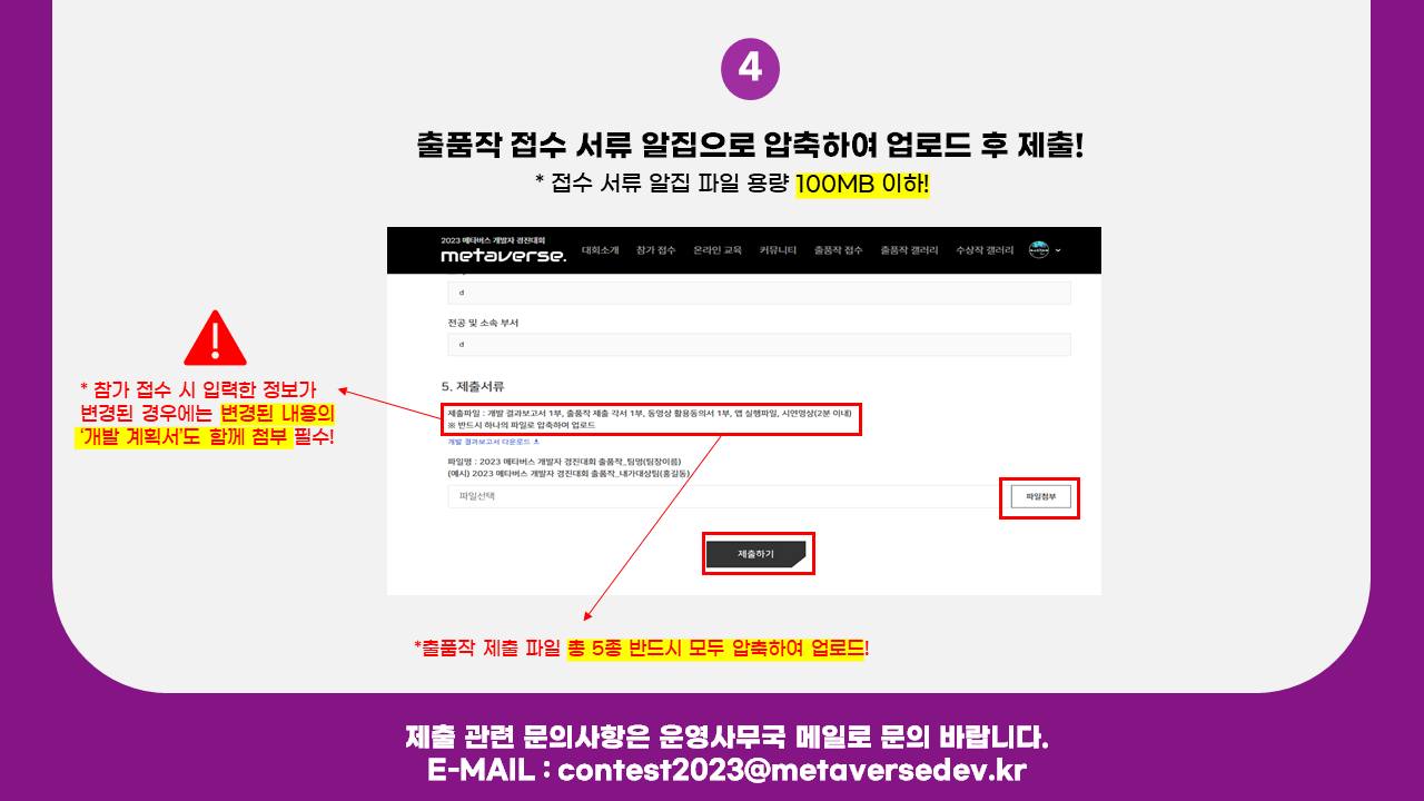 제출 관련하여 문의사항은 운영사무국 이메일(contest2023@metaversedev.kr)로 문의바랍니다.