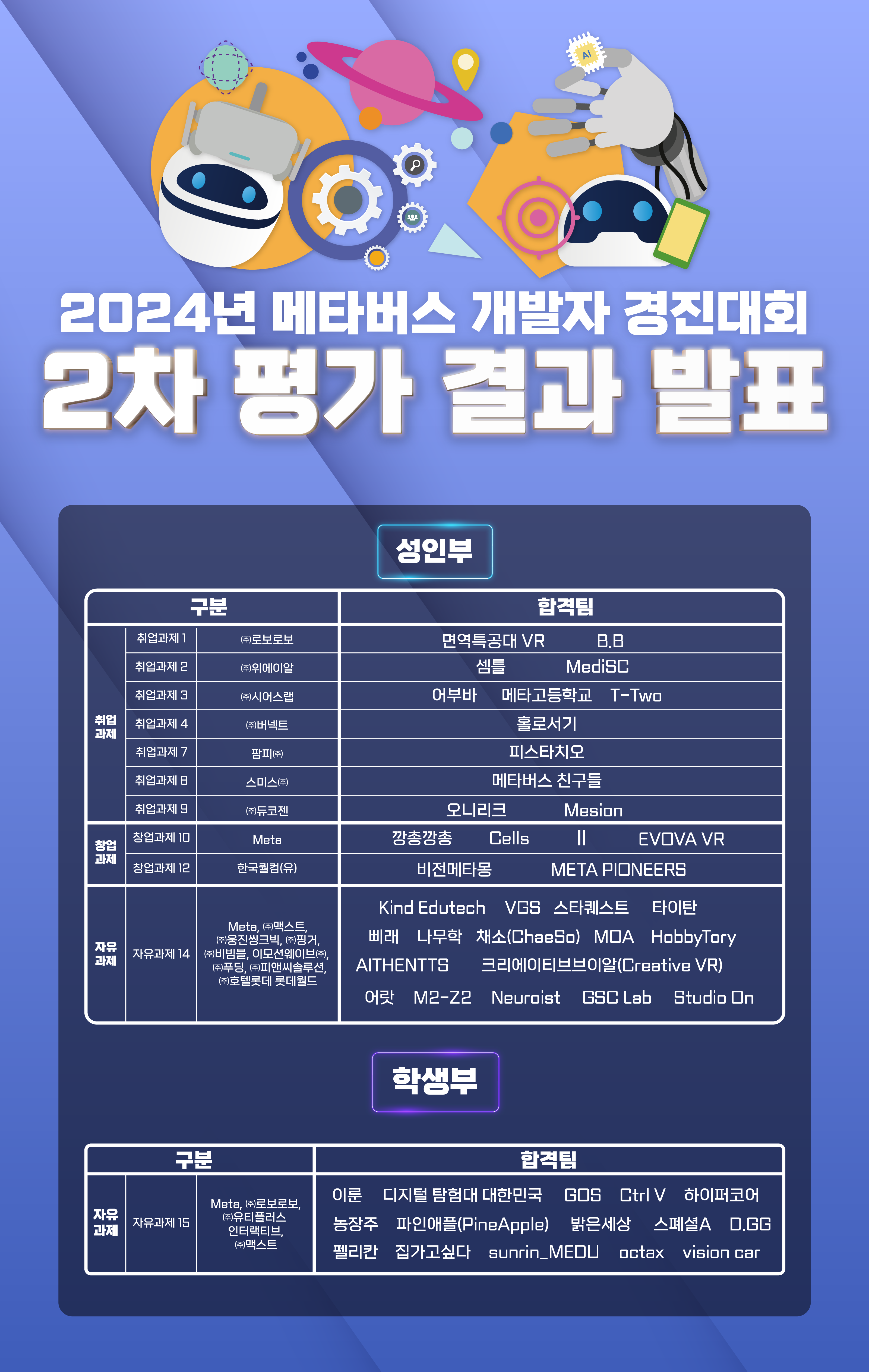 2차 평가 합격팀 발표 드립니다. 자세한 내용은 아래 이미지 참고 부탁드립니다.