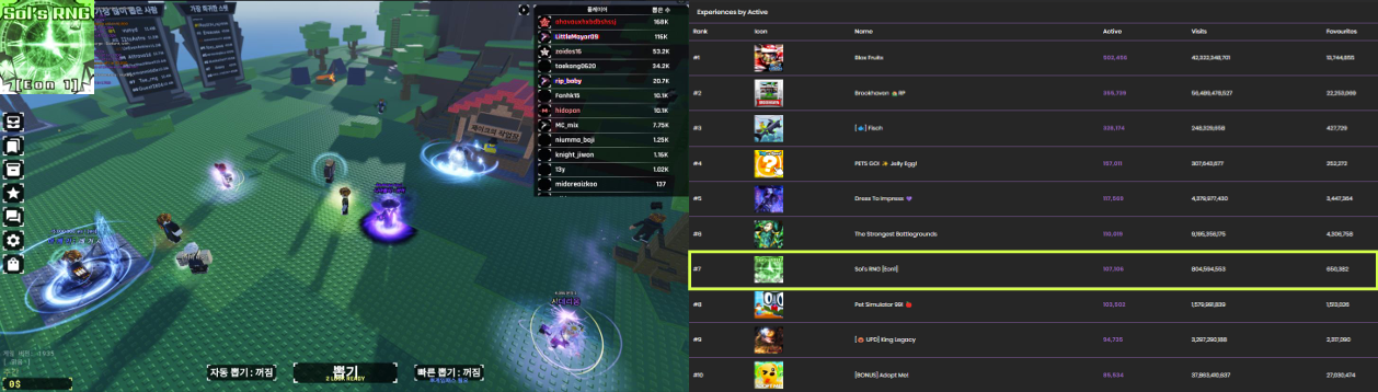 △ Roblox : 로블록스 UGC게임 제작. 로블록스 최고 3위 게임(Sol’s RNG) 보유, 동시접속자 수 15만명, 총 유저 소비시간 3억 시간 달성