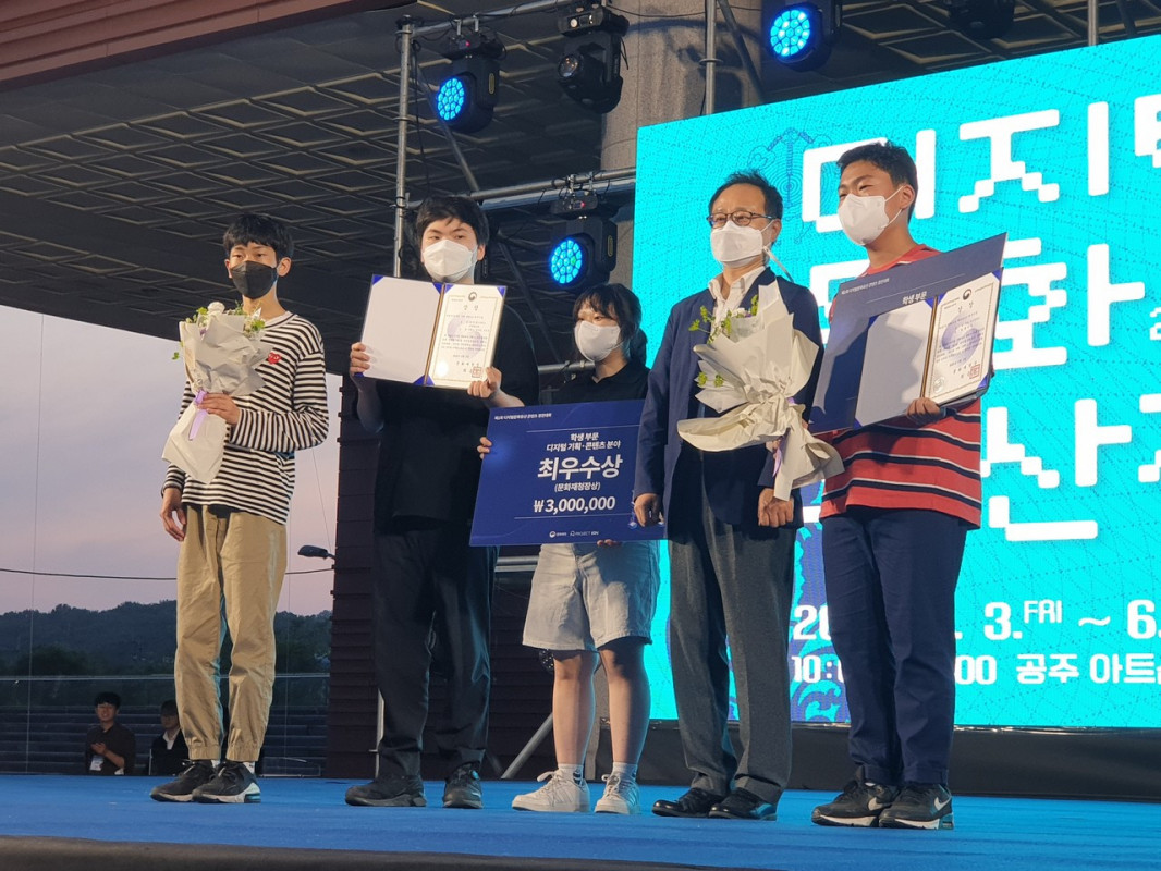 문화재청 주관 '제1회 디지털 문화유산 콘텐츠 경진대회' 시상식에서 황찬우 학생이 강경환 문화재청 차장으로부터 최우수상을 받고 기념 사진을 촬영하는 모습. (사진=박진호 박사 제공).