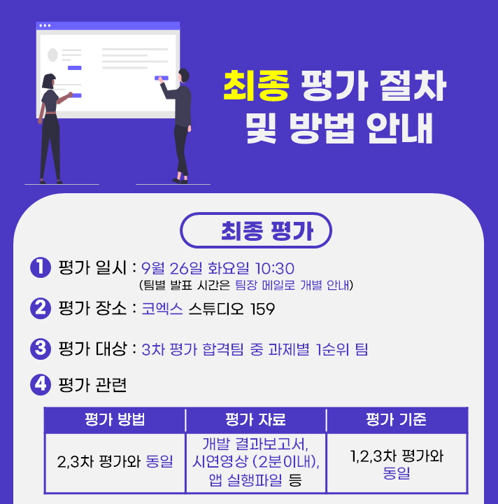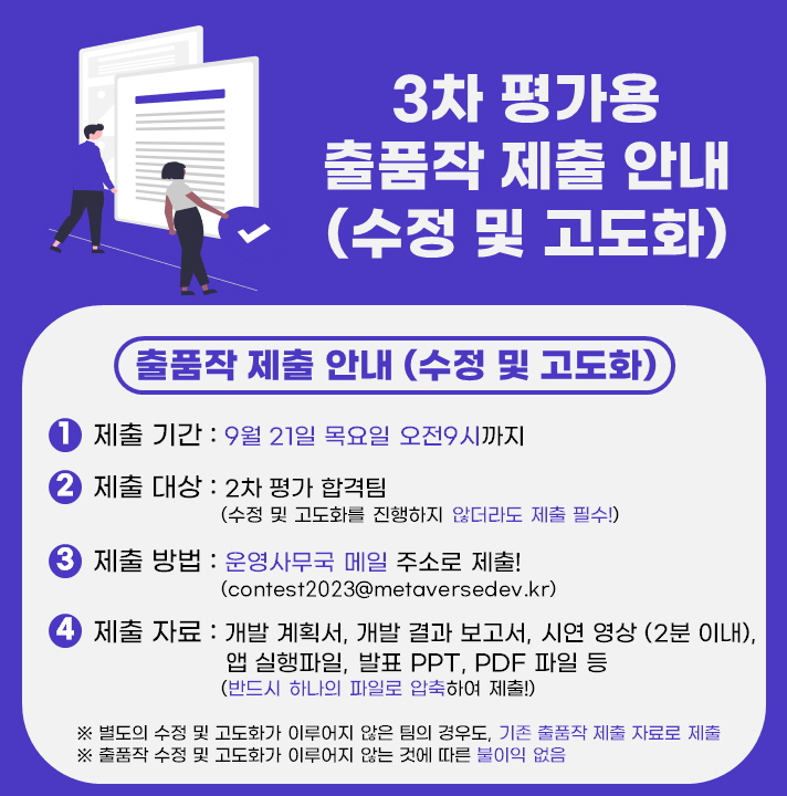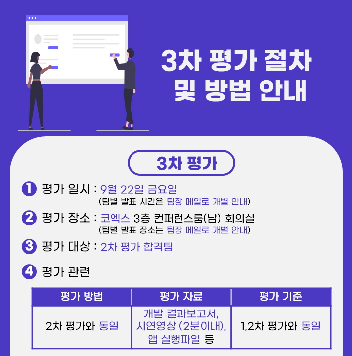 9/22(금)에 있을 3차 평가 관련하여 업그레이드 출품작 제출 안내 및 3차, 4차 평가 절차 및 방법 안내 드립니다.
