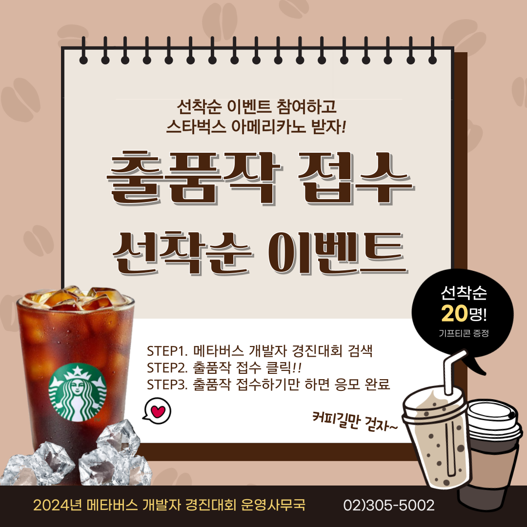 출품작 접수를 하시는 선착순 20명에게 스타벅스 기프티콘을 증정할 예정입니다, 모두 출품작 접수를 잘 마무리 하시길 바랍니다.